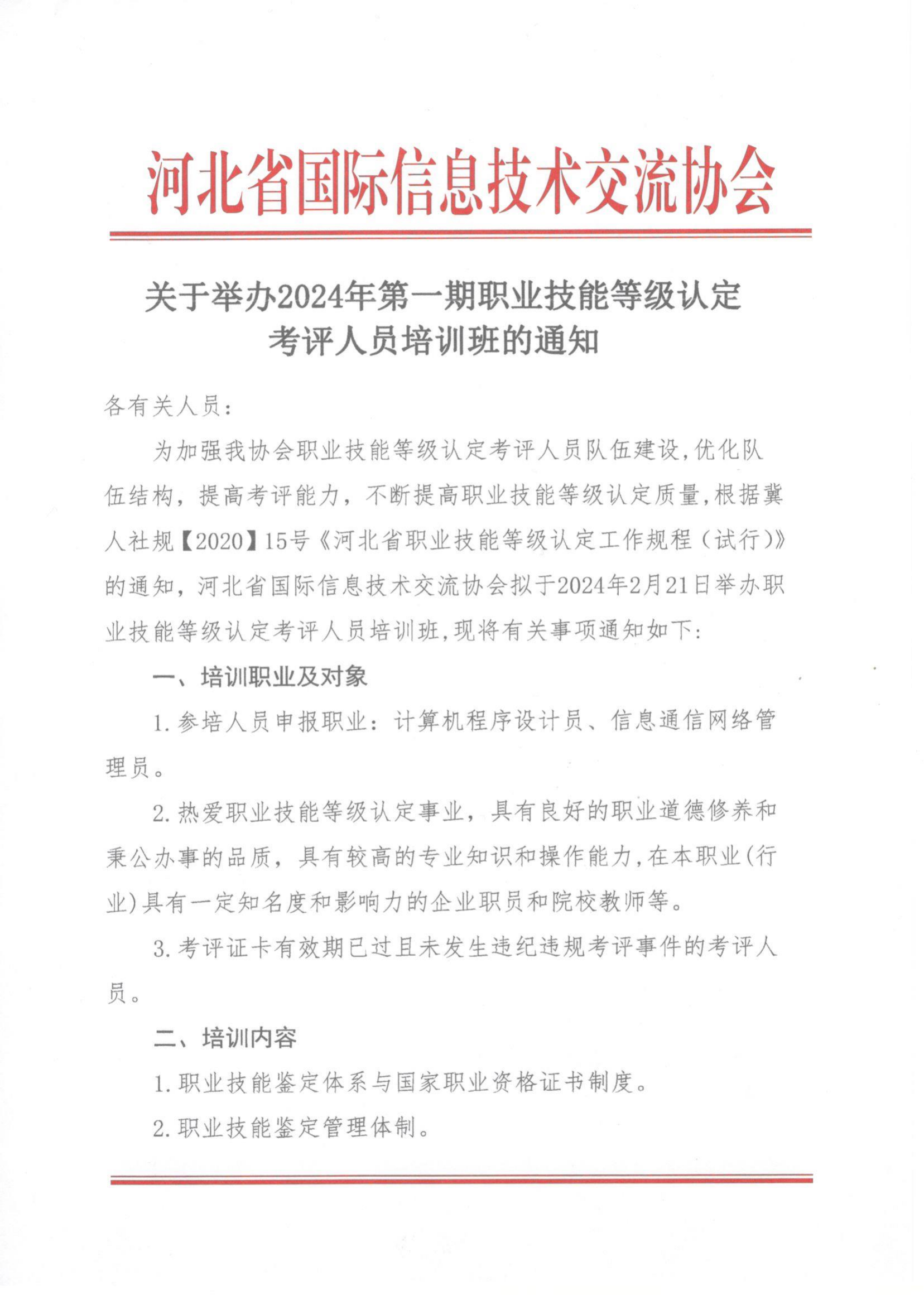 关于举办2024年第一期职业技能等级认定考评人员培训班的通知